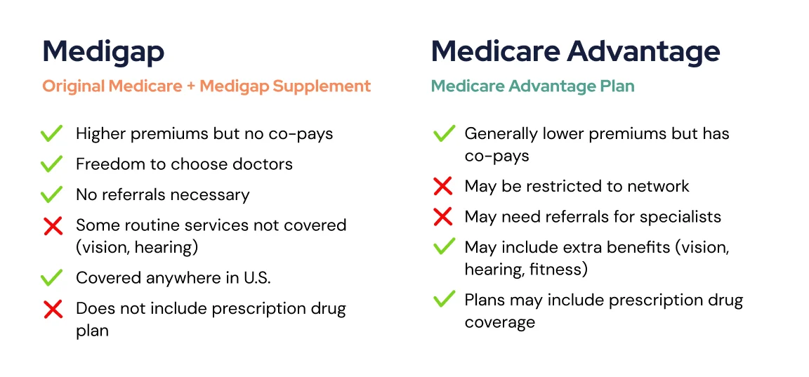 Unlike Medicare Advantage, Medigap does not include prescription drug coverage or other additional benefits—but it provides broader flexibility to choose doctors nationwide.